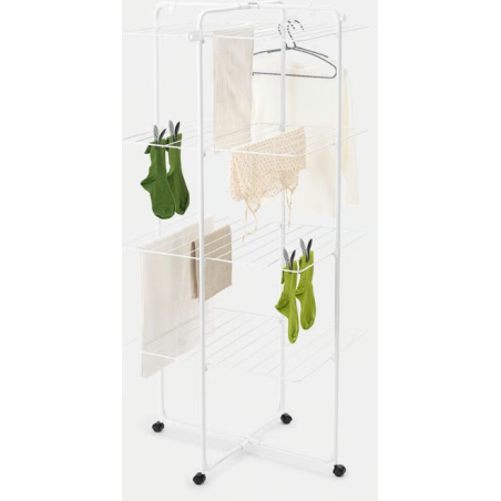 Uštedite energiju prirodnim sušenjem rublja i uštedite prostor tako što ćete ga objesiti na ovaj Brabantia HangOn toranj za sušenje rublja! S 30 metara fleksibilnog prostora za sušenje plus dodatnim kukama i držačima za vješalice za odjeću, ovaj pametni stalak za sušenje zauzima minimalan prostor na podu - prava ušteda prostora. Sadrži četiri razine sušenja od kojih se svaka može sklopiti prema potrebi, što ga čini prikladnim i za iznimno dugačke predmete poput hlača. Četiri kotača čine ga rotirajućim i mobilnim. Kad je sve osušeno i gotovo, sklapa se za kompaktnu pohranu. Transportne brave drže okvir na okupu i služe kao kuke. Kupnjom ovog stalka podržavate i WeForest u sadnji više drveća. Želite li se družiti?