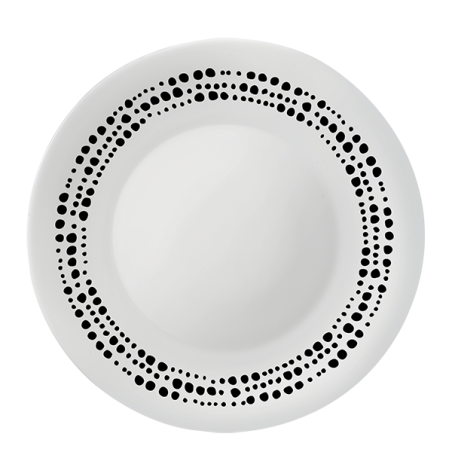 Izrađena od otpornog kaljenog opalnog stakla, ukrašena je tehnikom zahvaljujući kojoj boje s vremenom ostaju nepromijenjene: tanjur se može kombinirati s pločom za juhu i tanjurom za desert, ali se također podudara s modelima iz iste kolekcije s različitim ukrasima, za ugodan efekt "mix and match".