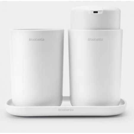 Pretvorite svoju kupaonicu u oazu mira s ovim elegantnim priborom za kupanje ReNew u setu od 3 komada iz Brabantije. Dozator sapuna koji se lako puni i ne kaplje drži vaš omiljeni sapun pri ruci, dok držač četkice za zube drži zajedno vaše četkice i pastu za zube. Polica služi za odlaganje manjih stvari ili kao podmetač za druga dva predmeta. Uredna i lijepa kupaonica – jednostavno kao jedan, dva, tri.