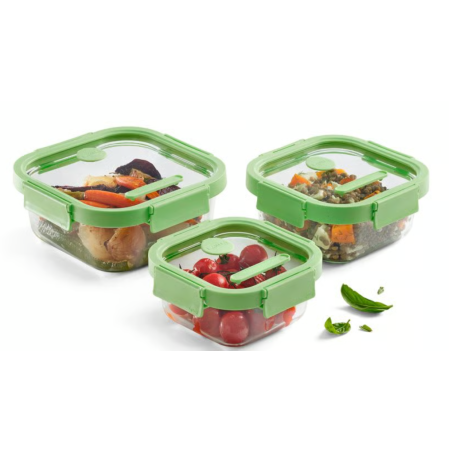 Dizajnirane kako bi vaša hrana dulje ostala svježa i ukusna, naš sustav omogućuje vam jednostavnu organizaciju kuhinje, izradu tjednih jelovnika i izbjegavanje otpada. Izrađene od vrhunskog borosilikatnog stakla, ove hermetički zatvorene posude nude iznimnu izdržljivost, čuvajući vašu hranu sigurnom i svježom. Njihovi stakleni poklopci otporni na toplinu ne samo da održavaju hranu svježom, već se i lako čiste te sprječavaju mrlje i mirise. Ugrađeni ventil omogućuje vam zagrijavanje u mikrovalnoj pećnici bez skidanja poklopca. Uključuju datumer kako biste mogli precizno pratiti svoju hranu. Dizajn koji se može slagati, optimalno iskorištavajući prostor u vašem hladnjaku i smočnici. Svestrane za skladištenje i transport hrane. Praktične, jednostavne za korištenje i izdržljive! Spremite svoju hranu i uživajte u njoj kao nikad prije! Staklene posude od 1100 ml, 800 ml i 520 ml.