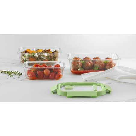 Naše staklene posude idealno su rješenje za vaše potrebe skladištenja hrane. Dizajnirane kako bi vaša hrana dulje ostala svježa i ukusna, naš sustav omogućuje vam jednostavnu organizaciju kuhinje, izradu tjednih jelovnika i izbjegavanje otpada. Izrađene od vrhunskog borosilikatnog stakla, ove hermetički zatvorene posude nude iznimnu izdržljivost, čuvajući vašu hranu sigurnom i svježom. Njihovi stakleni poklopci otporni na toplinu ne samo da održavaju hranu svježom, već se i lako čiste te sprječavaju mrlje i mirise. Ugrađeni ventil omogućuje vam zagrijavanje u mikrovalnoj pećnici bez skidanja poklopca. Uključuju datumer kako biste mogli precizno pratiti svoju hranu. Dizajn koji se može slagati, optimalno iskorištavajući prostor u vašem hladnjaku i smočnici. Svestrane za skladištenje i transport hrane. Praktične, jednostavne za korištenje i izdržljive! Spremite svoju hranu i uživajte u njoj kao nikad prije!